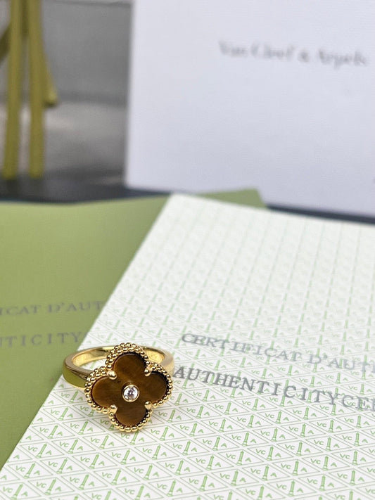 [✨Rose💎]CLOVER TIGER'S EYE RING GOLD DIAMOND